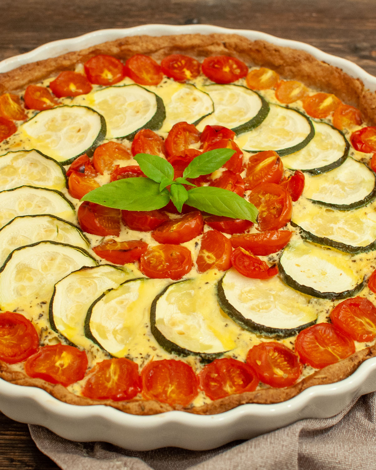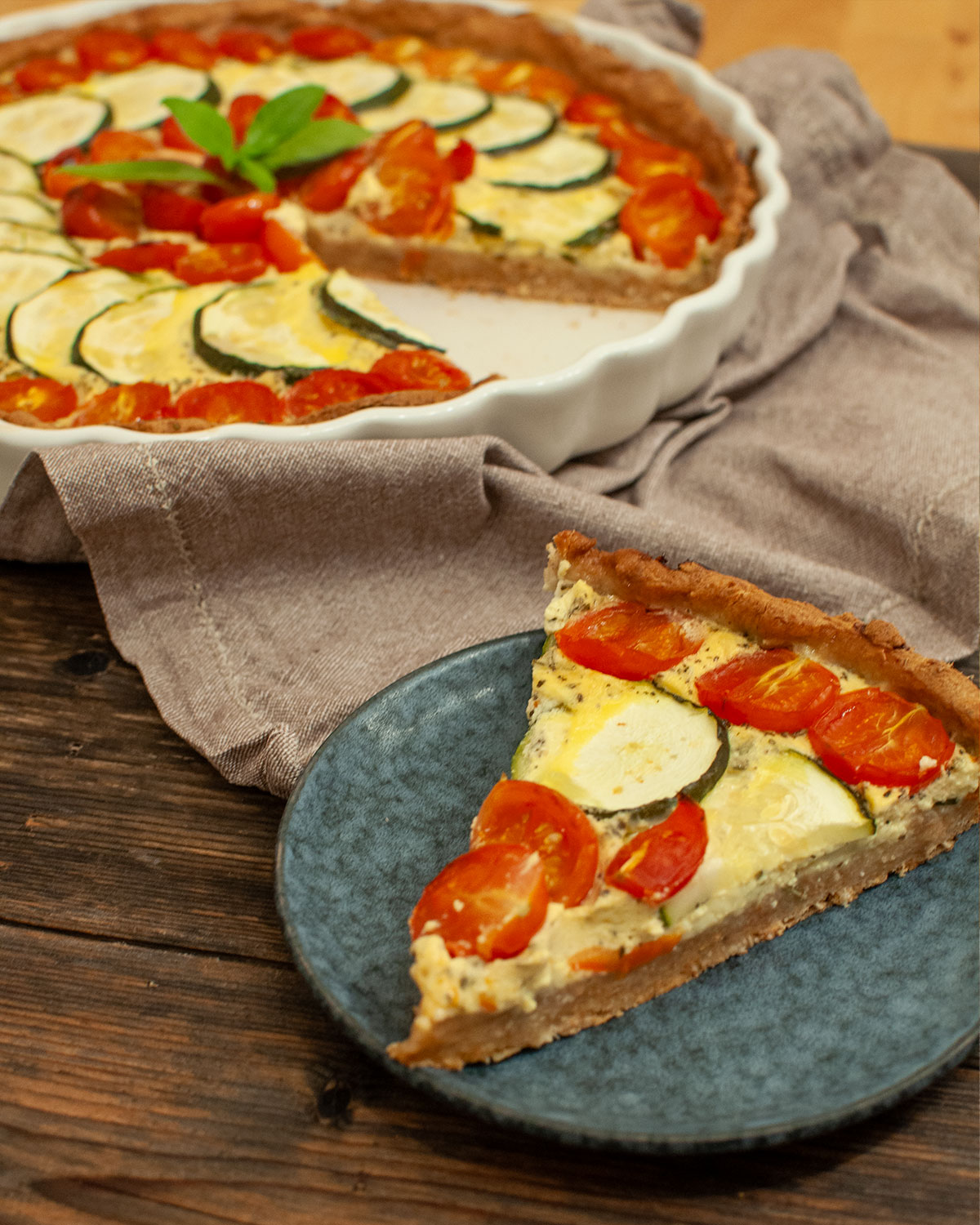 Unsere Tomaten-Zucchini-Quiche besteht aus einem Dinkelteig mit Vollkorn-Anteil, kommt ganz ohne Butter aus und bekommt durch südliche Kräuter und Käse ein besonders vollmundiges Aroma. Ob als Mittagessen, Abendessen, fürs Buffet oder fürs Meal Prep – die Quiche schmeckt warm, lauwarm und sogar am nächsten Tag noch richtig gut.
